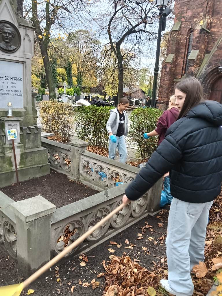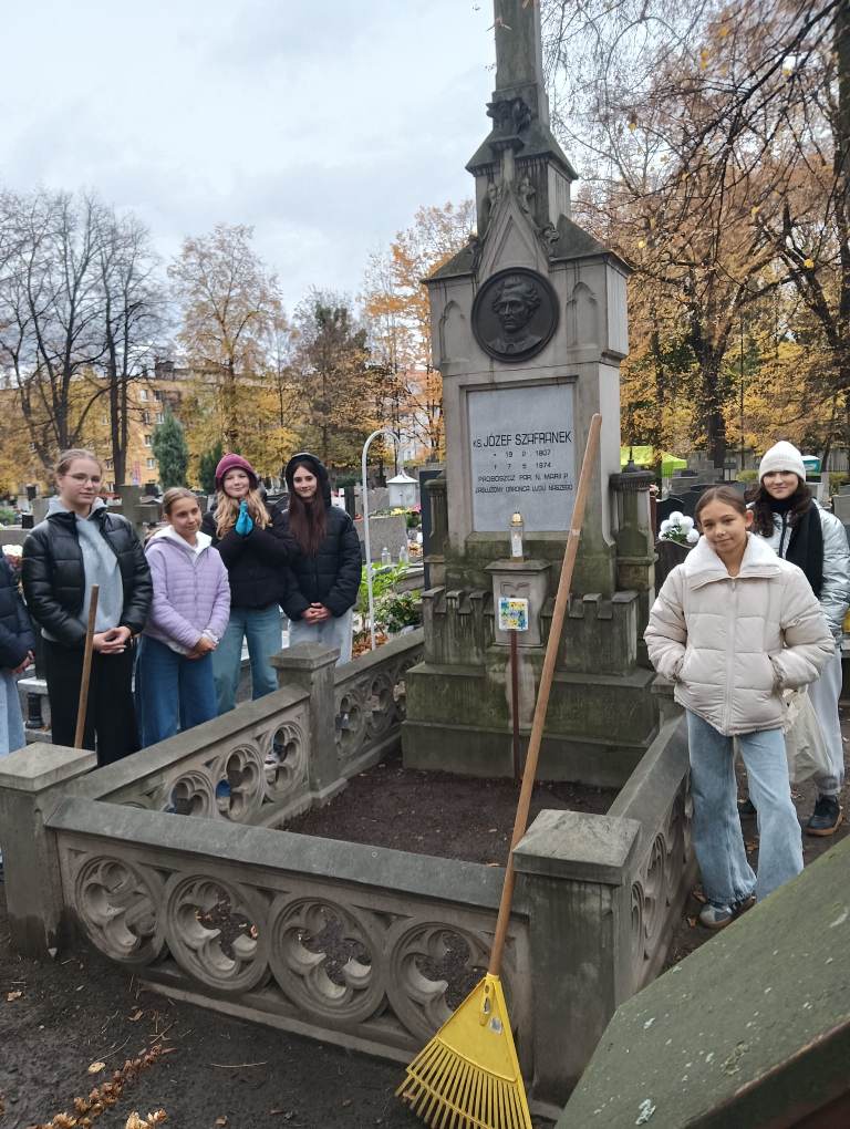 Z okazji zbliżającej się Uroczystości Wszystkich Świętych, grupa uczennic z 8c udała się na cmentarz, żeby uporządkować i przyozdobić grób ks. Józefa Szafranka. Efekty pracy widać na załączonych zdjęciach. Dziękujemy jak zawsze niezawodnej p. Bożenie ze świetlicy za piękny stroik.