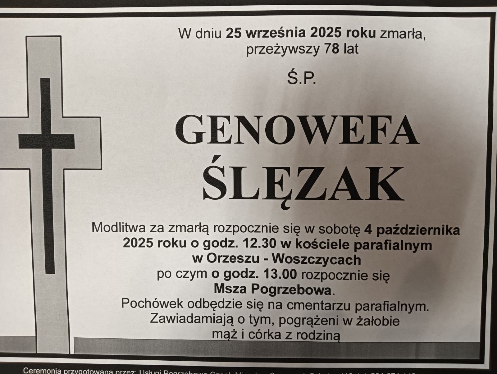 Uroczystości pogrzebowe odbędą się w sobotę 4 października 2025 r. o godz. 13:00 w kościele parafialnym w Orzeszu-Woszczycach, po czym nastąpi pochówek na cmentarzu parafialnym.